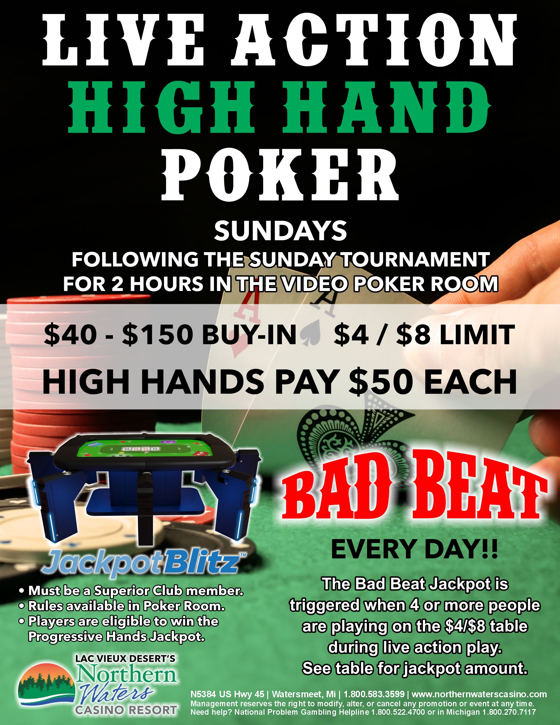 Welcome to the future of poker! Our Jackpot Blitz electronic poker room brings dealer-free action to the floor — blending classic strategy with modern convenience. Play Texas Hold’em and other favorites on state-of-the-art touchscreens watching the bad beat grow each week! Whether you're a seasoned player or just learning the ropes, the intuitive design and low-pressure vibe makes it easy to join the game. Available 24/7 for 18+. We welcome you to join our Friday night game with progressive jackpot hands as well as Sunday 4/8 live action limit game, and our Sunday Texas Hold’em Tournament.